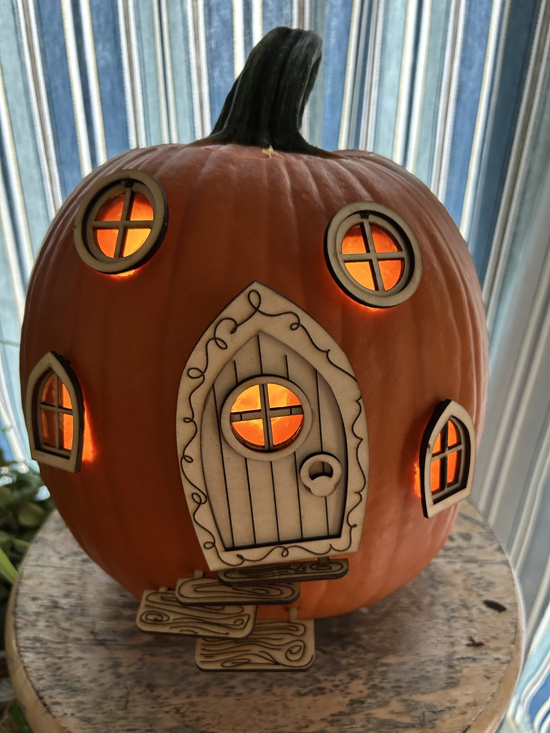 DIY Pumpkin Fairy House Kit – Unfinished Wooden Door, Windows, Chimney & Stairs for Carved Pumpkins